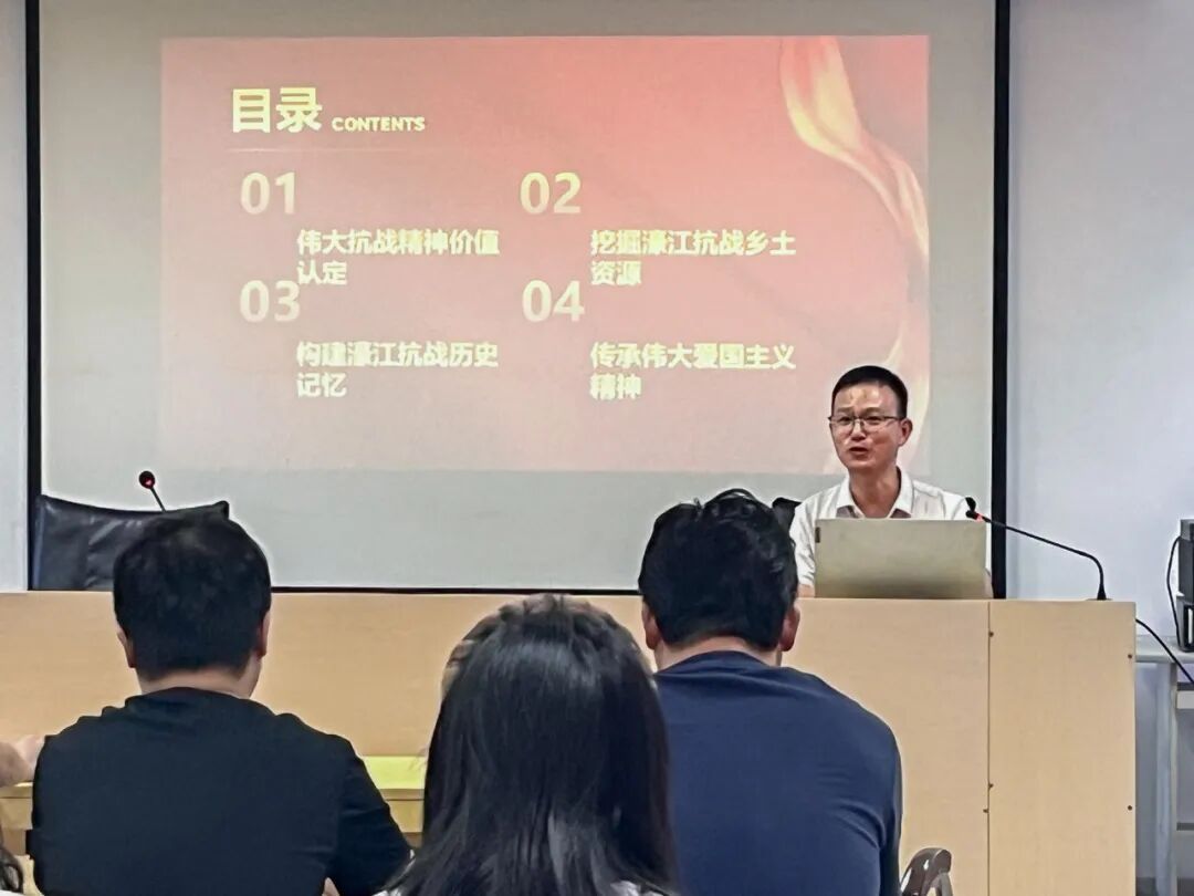 活动现场,汕头市达濠华侨中学教师陈爱辉围绕“挖掘本土抗战资源、构建地方集体记忆、推动爱国主义教育落地”作专题分享。他以濠江抗战历史为主线,系统梳理了东湖岭抗日战场、礐石日军碉堡等战争遗址,以及达濠万人墓、凤岗灾骸丛墓等纪念场所,并以“达濠万人墓”为核心案例,从集体记忆建构的理论视角,分析了达濠万人墓自1943年以来多次修缮与碑文更迭背后的社会记忆变迁。